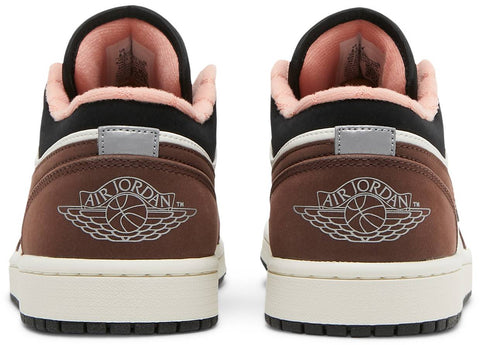The Jordan 1 Low Mocha features a white leather upper with Mocha Durabuck overlays and Swooshes. On the interior, bright pink lining pops against muted black Durabuck collars. A subtle Air Jordan Wings logo on the heel wrap adds the finishing touch.
