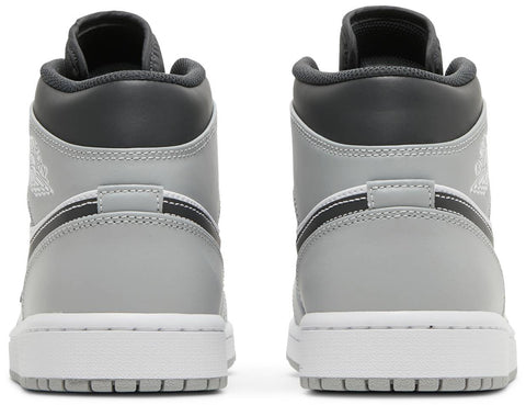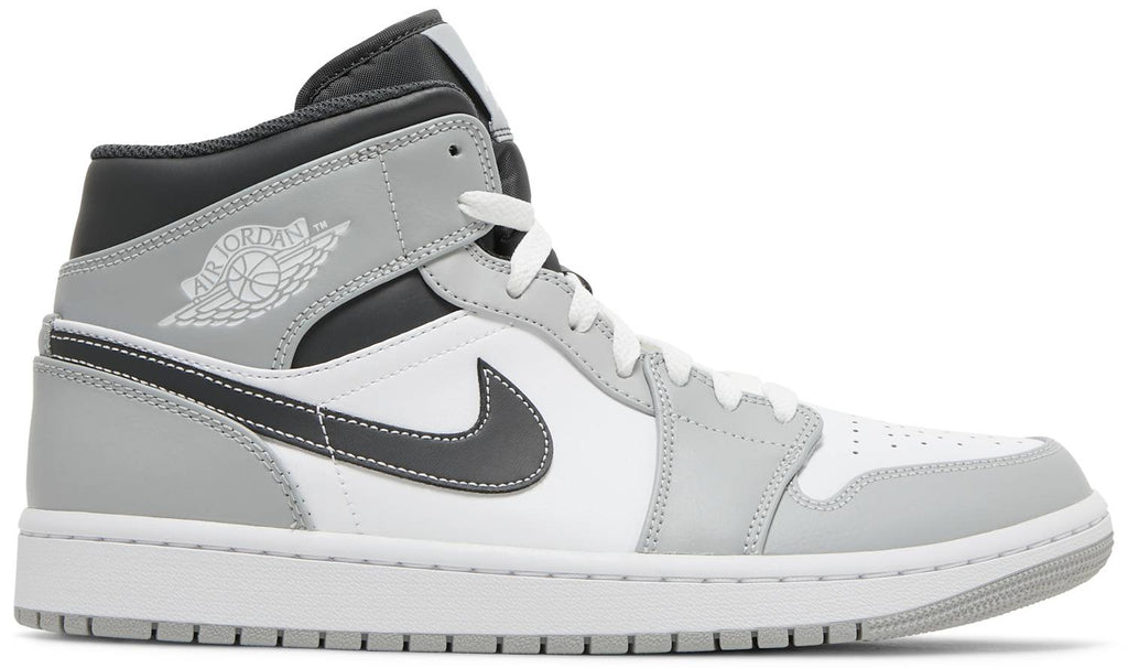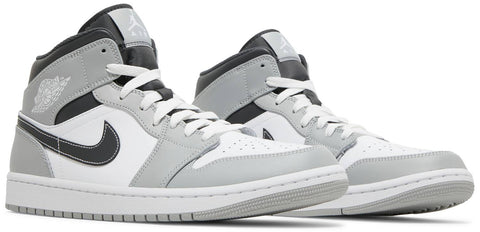 Dressed in a Light Smoke Grey, White, and Anthracite color scheme. This offering of the mid-top Air Jordan 1 comes constructed in a leather build featuring a White base with Light Smoke Grey overlays and Anthracite Swooshes, ankle collar, tongues, and liners. Contrasting stitching atop a White midsole and Grey rubber outsole completes the design.