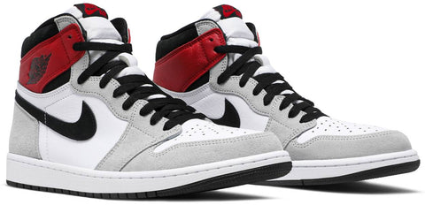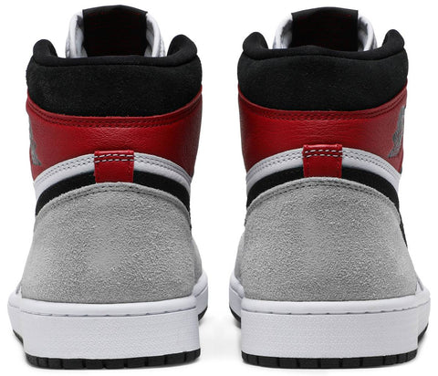 The Air Jordan 1 Retro High OG 'Smoke Grey’ showcases a pop of Varsity Red on the ankle flap, stamped with a classic Jordan Wings logo on the lateral side. The rest of the upper is finished in strictly neutral tones, highlighted by a white leather base with grey suede overlays. A black Nike Swoosh is complemented by matching black hits on the collar and rubber outsole. Nike branding atop the white nylon tongue tag completes the OG aesthetic.