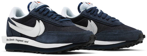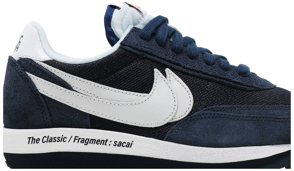 The Nike LDWaffle sacai Fragment Blue Void delivers a sneaker collaboration that leverages the creativity of renowned Japanese labels from the worlds of streetwear and high fashion. Blending elements from the Nike LDV and Waffle Racer, the hybrid silhouette is dressed in a traditional blend of mesh and suede. The tonal navy finish is contrasted by hits of white on the double-stacked leather Swoosh and heel tab, the latter marked with dual Nike and sacai branding. Woven Nike and Fragment tags adorn the doubled-up tongues, while the elongated foam midsole is inscribed with ‘The Classic / Fragment: sacai.’ Nike’s waffle-traction rubber outsole provides superior grip underfoot.